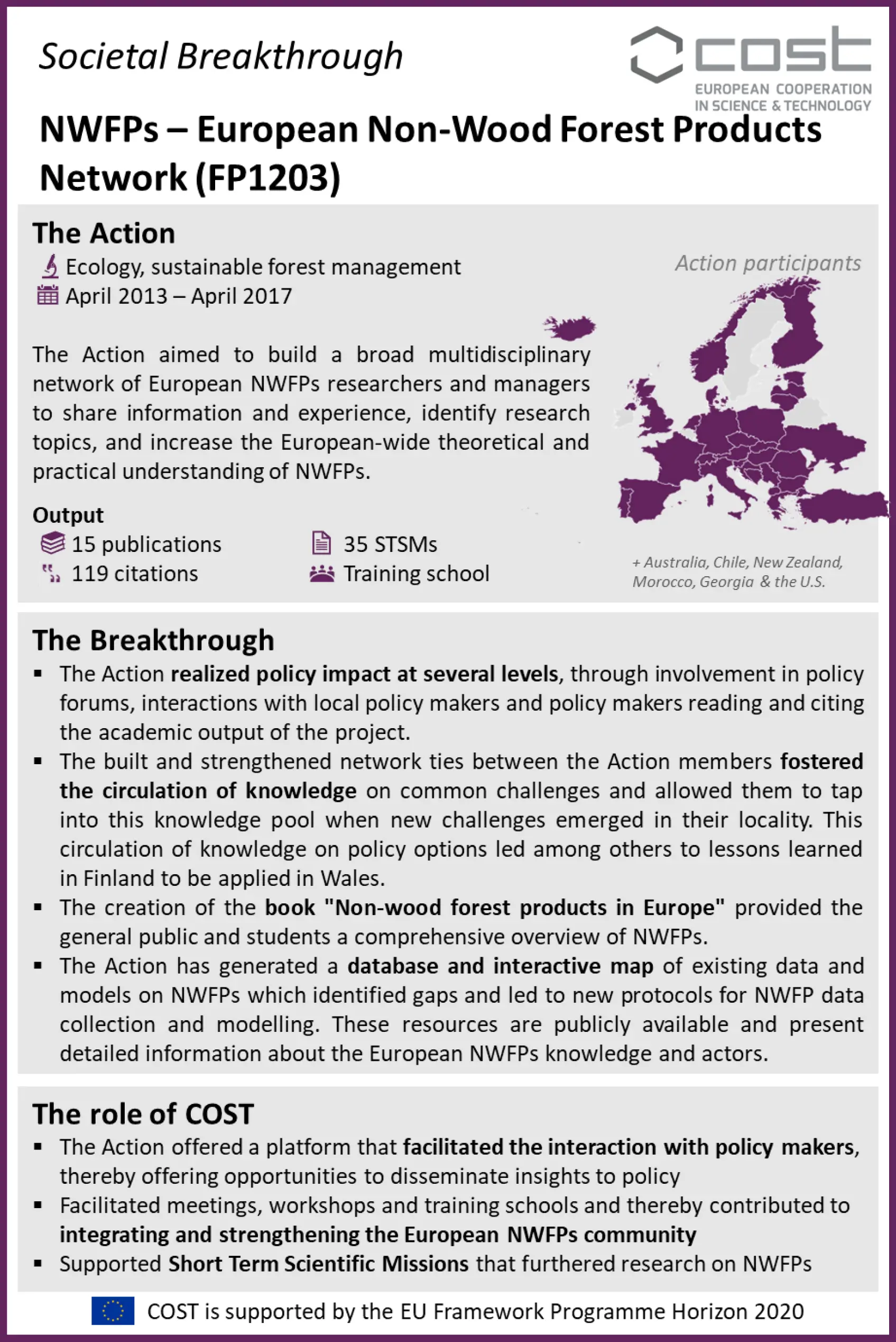 The breakthrough of this month is by COST Action “European non-wood forest products network (NWFPs)”, FP1203. This network’s strong policy and innovative dimension is demonstrated by the number of citations in several policy documents and the fact that it used a natural language processing approach, an AI method that allows computers understand language in a similar way humans do.