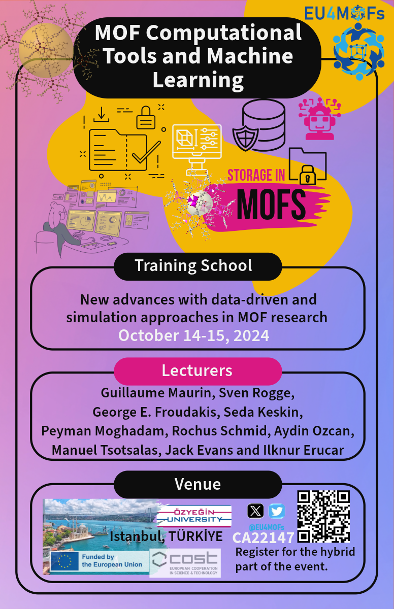 The aim of the training school is to provide participants with advanced knowledge and hands-on experience in utilizing data-driven approaches, machine learning techniques, and computational tools to enhance research and innovation in Metal-Organic Frameworks (MOFs). The school focuses on state-of-the-art simulation methods and their applications, equipping attendees with the skills needed to tackle complex challenges in MOF research, from material discovery to storage solutions.