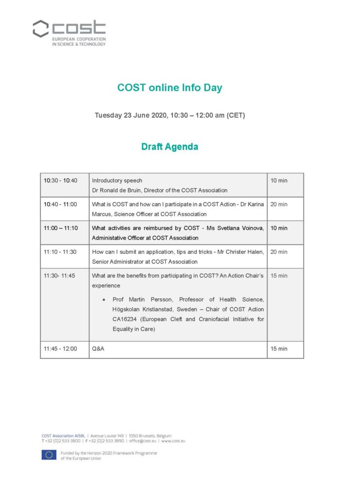 COST are holding an online Info Day on Tuesday 23 June. Attendees of the event will be able to learn about COST's role in promoting and spreading research excellence, the role and impact of the COST Programme and how to submit or connect with COST Actions.