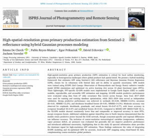 This publication presents a new hybrid Gaussian processes approach to estimate gross primary production (GPP)—the amount of carbon plants fix through photosynthesis—at high spatial resolution using Sentinel-2 reflectance data. By combining physical knowledge with data-driven modelling, the method produces more accurate and spatially detailed GPP maps, particularly in complex forest and vegetation landscapes. The results highlight the approach’s strong potential for improving carbon cycle assessments and supporting climate- and ecosystem-related monitoring efforts.