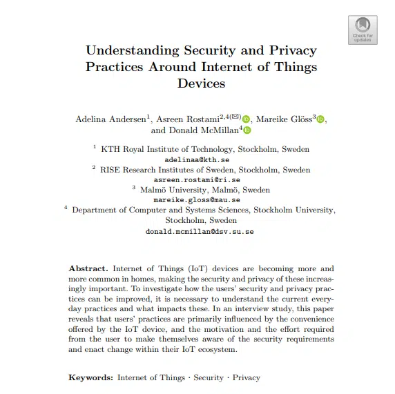 Internet of Things (IoT) devices are becoming more and more common in homes, making the security and privacy of these increasingly important. To investigate how the users’ security and privacy practices can be improved, it is necessary to understand the current everyday practices and what impacts these. In an interview study, this paper reveals that users’ practices are primarily influenced by the convenience offered by the IoT device, and the motivation and the effort required from the user to make themselves aware of the security requirements and enact change within their IoT ecosystem.