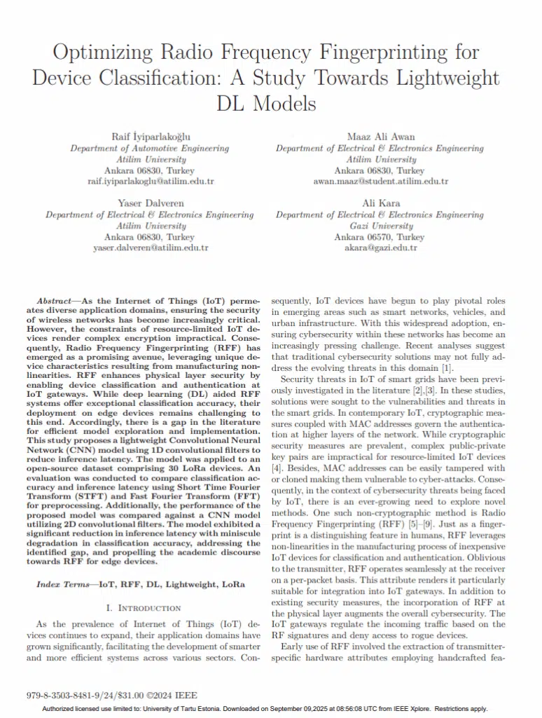 As the Internet of Things (IoT) permeates diverse application domains, ensuring the security of wireless networks has become increasingly critical. However, the constraints of resource-limited IoT devices render complex encryption impractical. Consequently, Radio Frequency Fingerprinting (RFF) has emerged as a promising avenue, leveraging unique device characteristics resulting from manufacturing nonlinearities. RFF enhances physical layer security by enabling device classification and authentication at IoT gateways. While deep learning (DL) aided RFF systems offer exceptional classification accuracy, their deployment on edge devices remains challenging to this end. Accordingly, there is a gap in the literature for efficient model exploration and implementation. This study proposes a lightweight Convolutional Neural Network (CNN) model using 1D convolutional filters to reduce inference latency. The model was applied to an open-source dataset comprising 30 LoRa devices. An evaluation was conducted to compare classification accuracy and inference latency using Short Time Fourier Transform (STFT) and Fast Fourier Transform (FFT) for preprocessing. Additionally, the performance of the proposed model was compared against a CNN model utilizing 2D convolutional filters. The model exhibited a significant reduction in inference latency with miniscule degradation in classification accuracy, addressing the identified gap, and propelling the academic discourse towards RFF for edge devices.