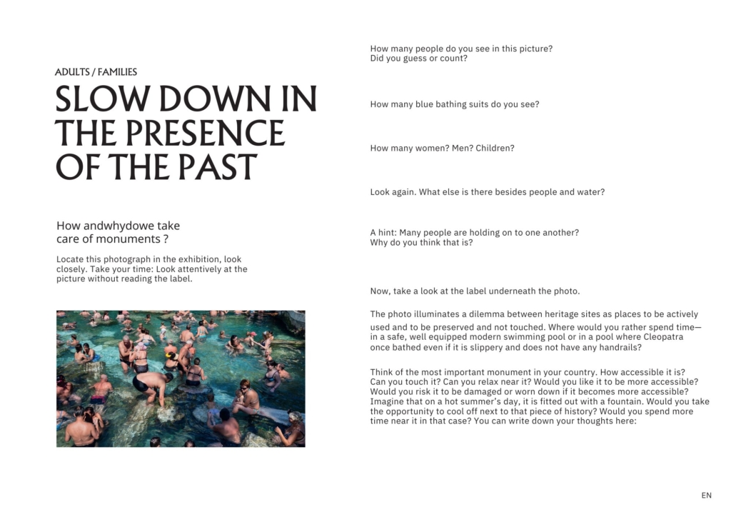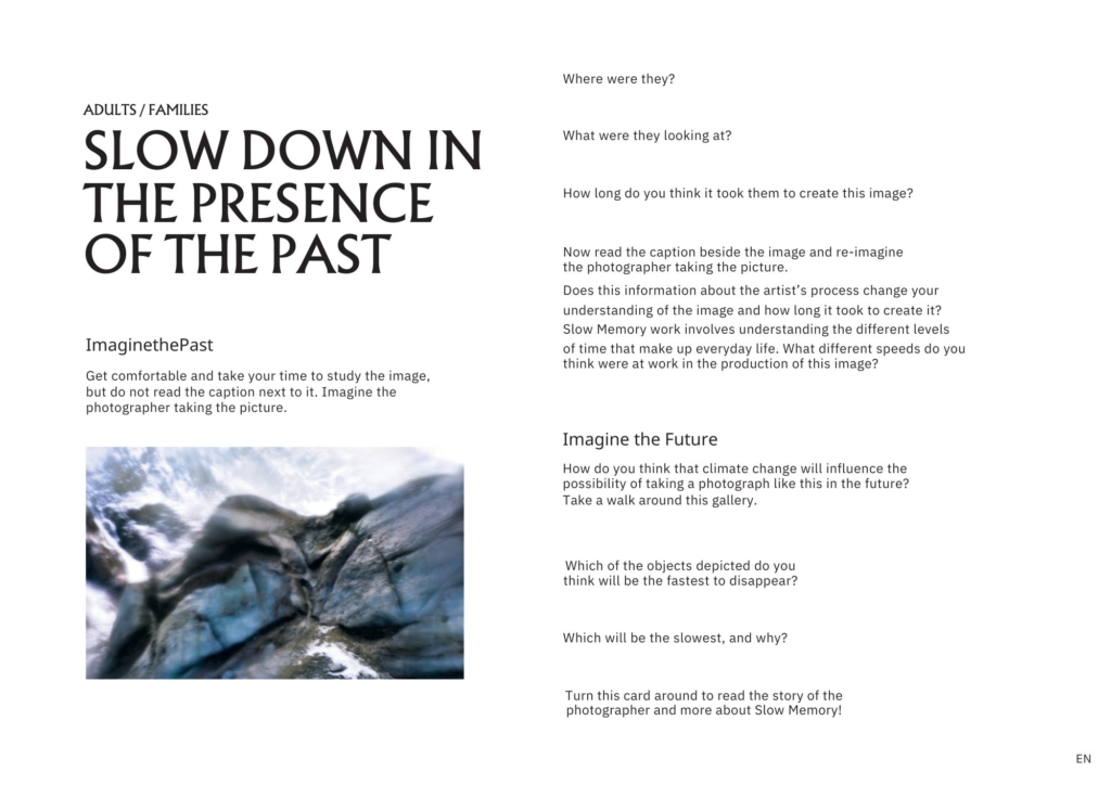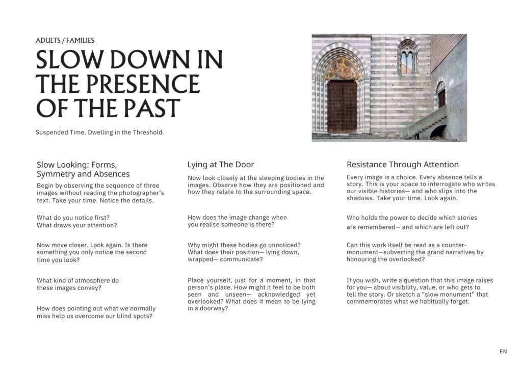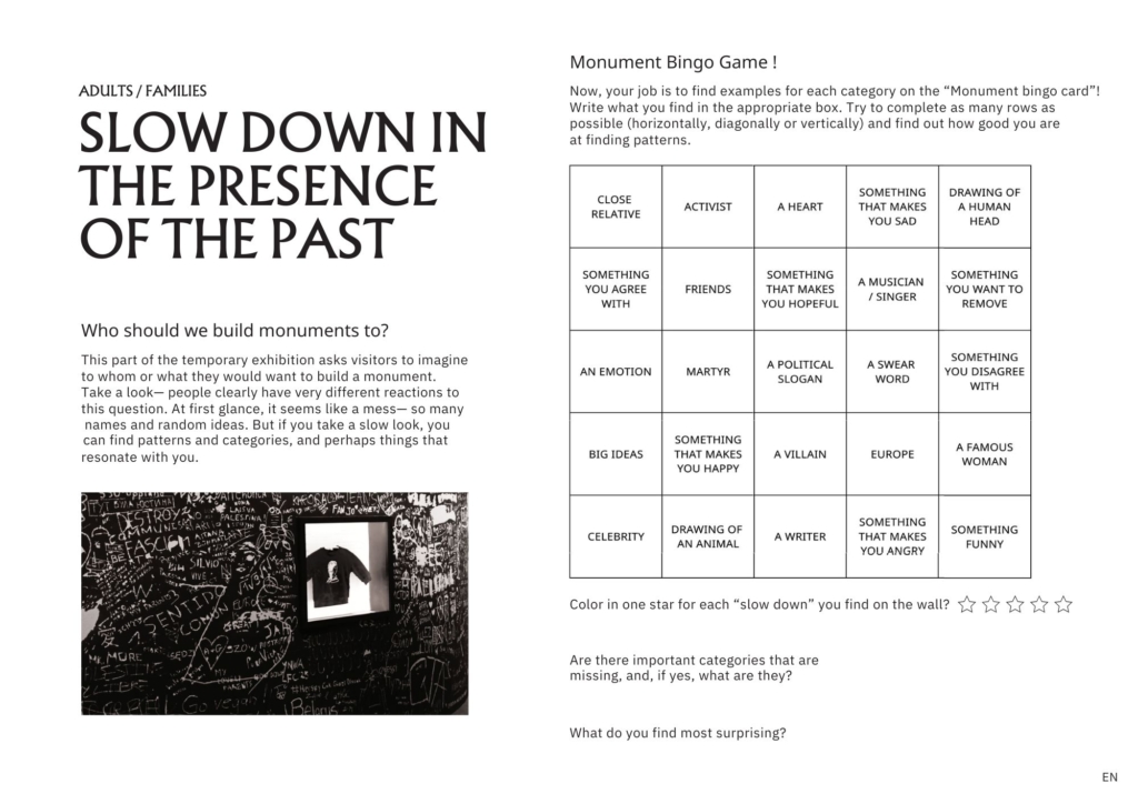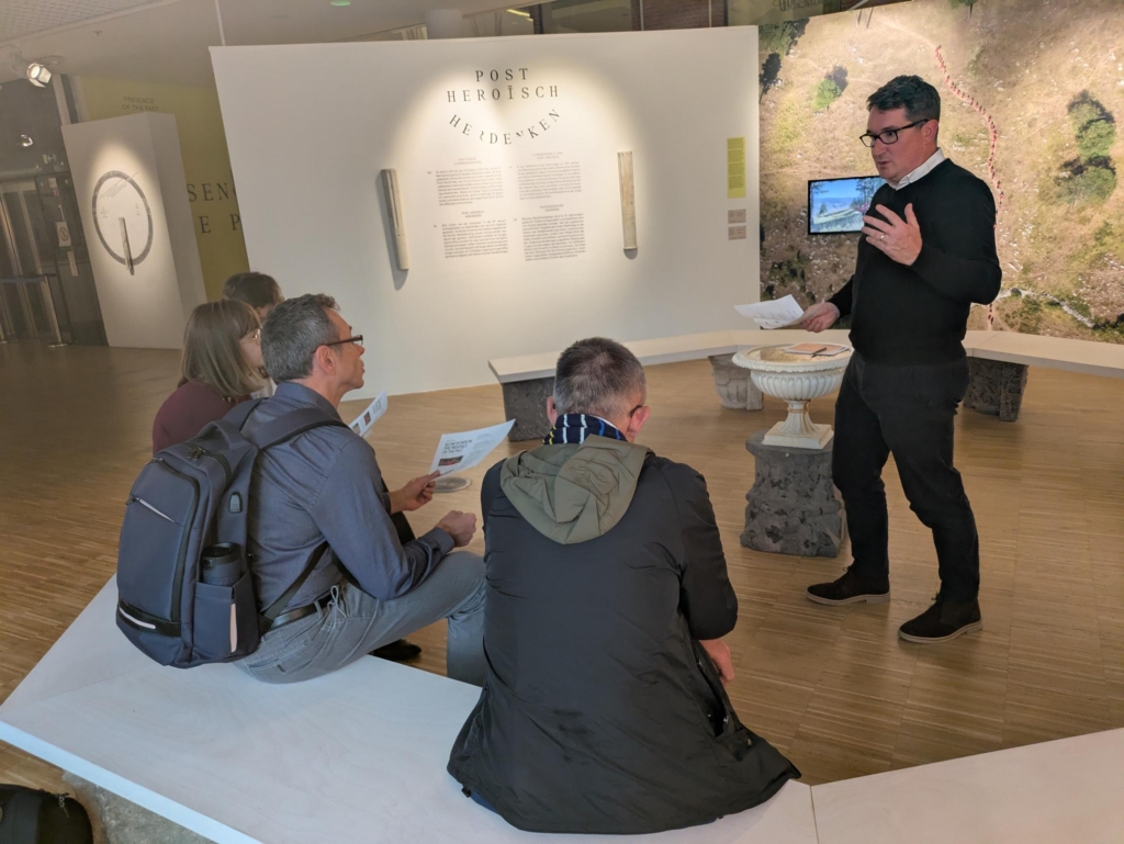 Fantastic! About 10 researchers from the core group of the Slow Memory Action came to Brussels in May 2025. After presenting the key concepts of Slow Memory, Simina and Stephanie treated us to a detailed guided tour of The Presence of the Past exhibition explaining not only each photographer’s approach, but the guiding ideas of the exhibition and the process of curation. Then we just brainstormed and came up with the idea of creating “activity cards” that visitors could take into the exhibition to help them take a slow memory approach. These were then developed by small teams over the next few months, designed and translated – and now they are available for use in the museum.